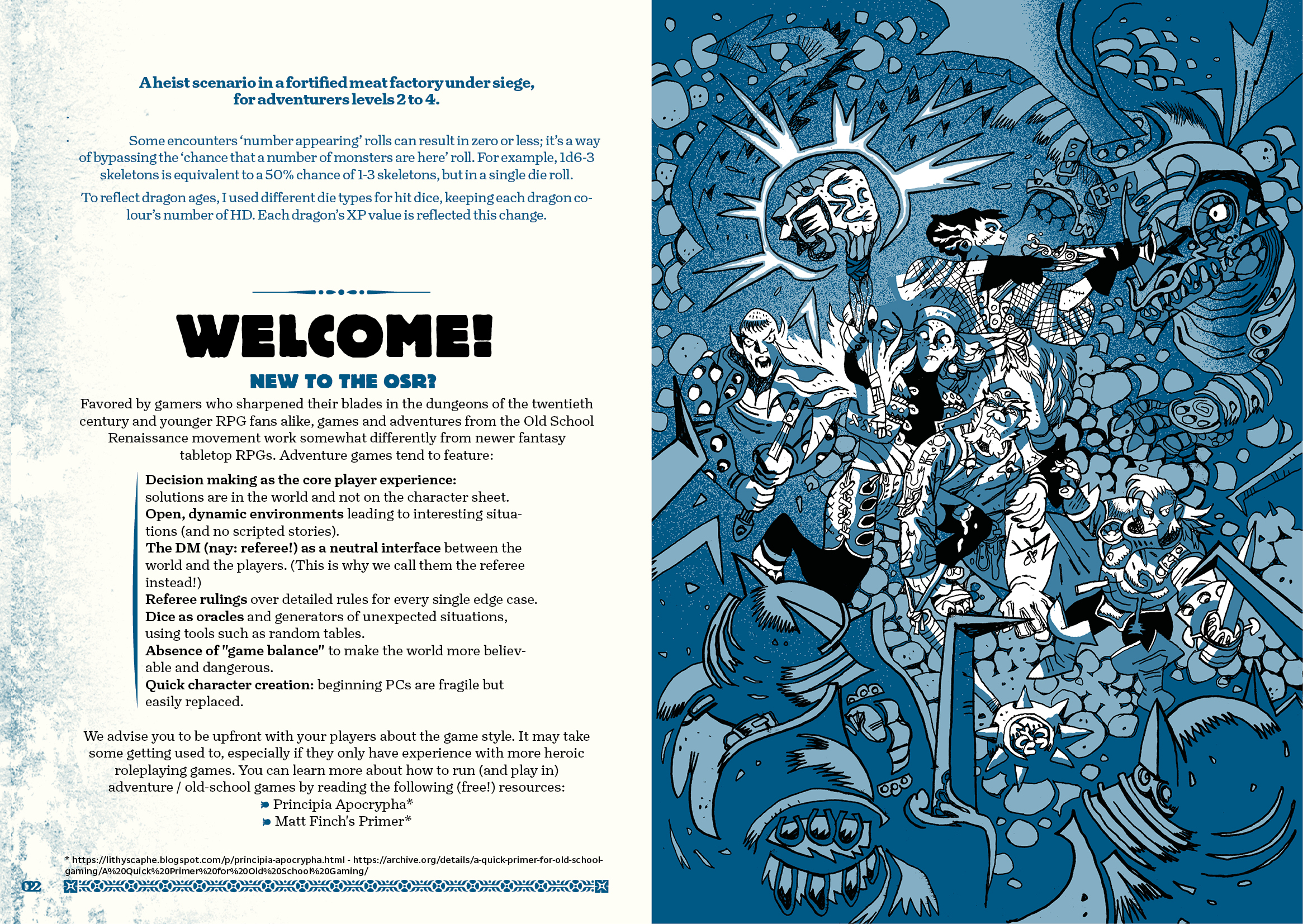 The adventure is a dynamic dungeon of about 45 areas with a 40-entry encounters/events/environment table, as well as a countdown procedure. Players will have to be quick to achieve their goals (we provide a choice of them), grab some valuable tins of Dragonmeat™, and get out before the siege ends in a bloodbath.