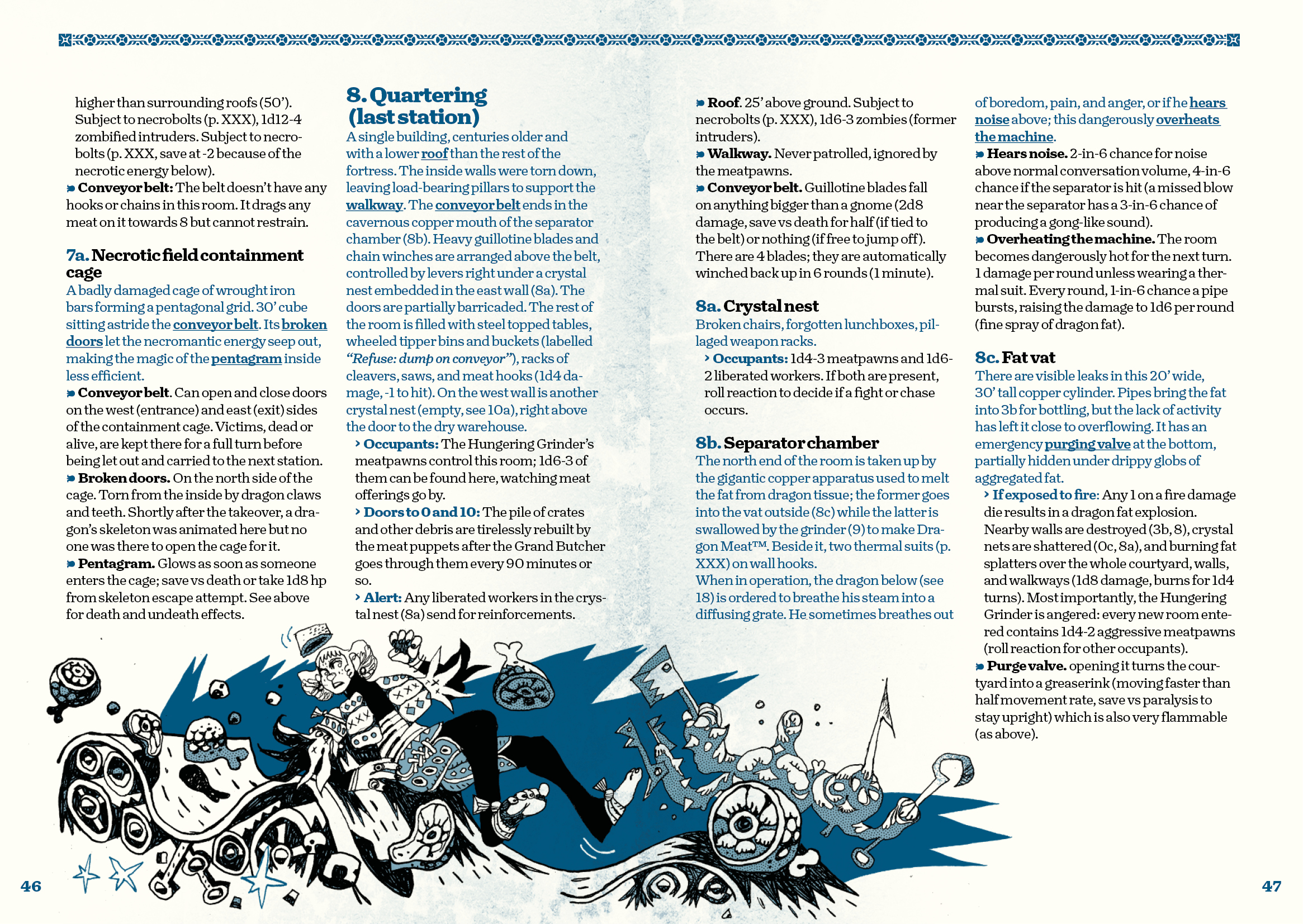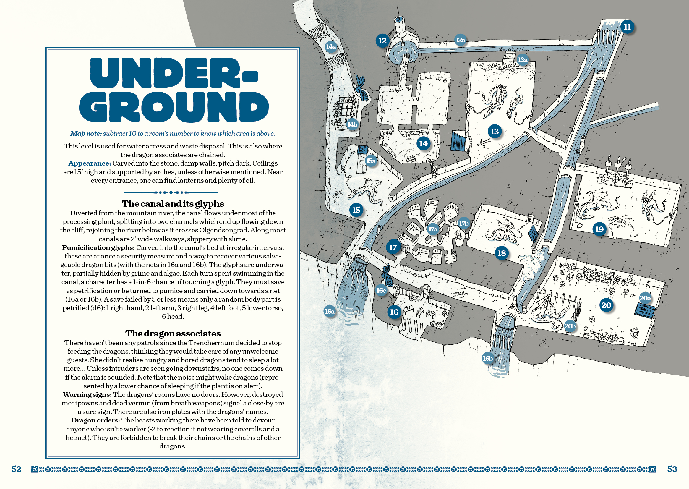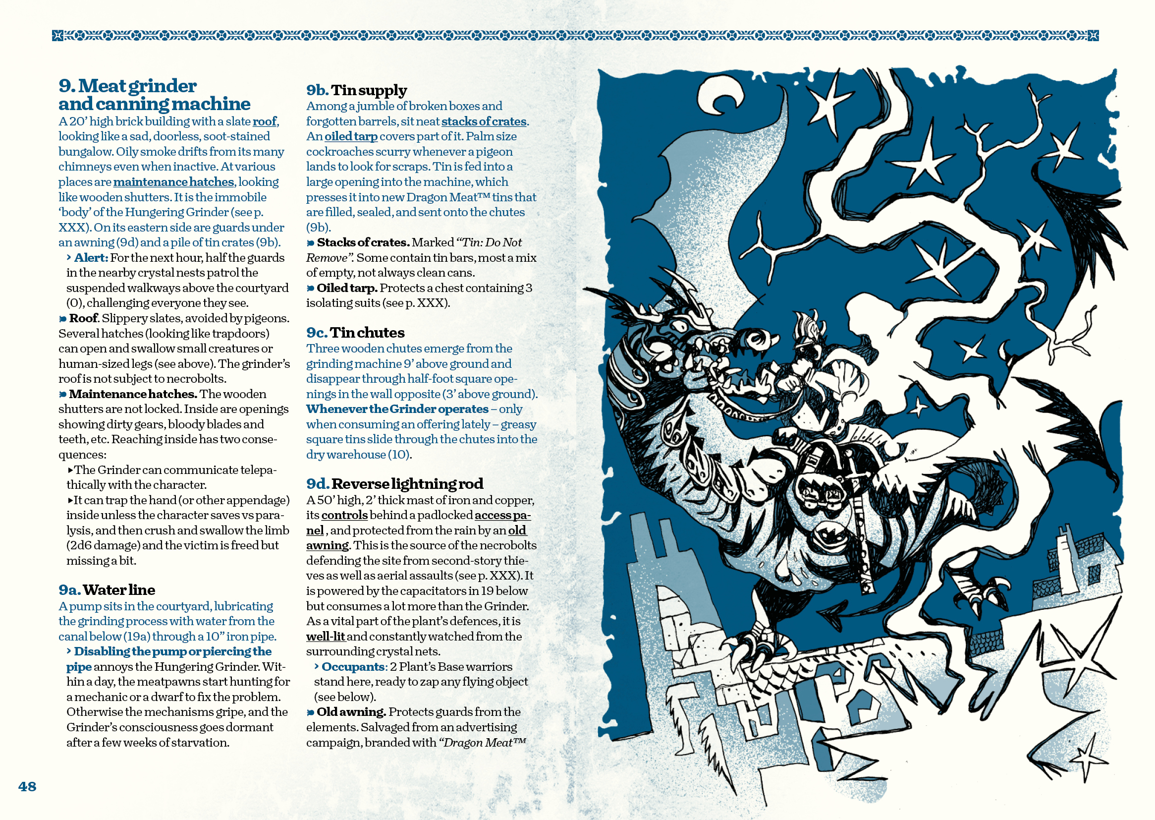 Enter the player characters… The Plant’s Base union is in control of most of the facility, but strange things are happening with the plant’s automaton workers, the automated conveyor belt and grinding machine, and the meat-addicted pigeons that plague the roofs. Worse even, something is haunting the waste canals of the sub-level below where the dragon associates are chained.